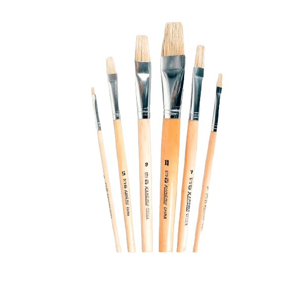Los pinceles son hechos de madera con virola de metal. vienen en varios tamaños catalogados por número los hay de cerdas duras y cerdas suaves se usan para pintar con diferentes técnicas como